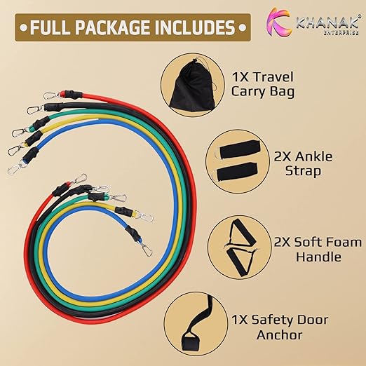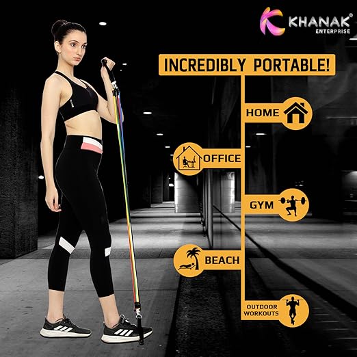 Product Description Brand KHANAK ENTERPRISE Material Natural Rubber Colour black Item Weight 150 Grams Sport Home Workout About this item ✔ 5 Colors Levels of Resistance – Resistance Bands Set includes – Black (30 lbs.), Green(15 lbs.), Blue (25 lbs.), Red (15 lbs.), and Yellow (10 lbs.). The bands can be used alone or stacked…
